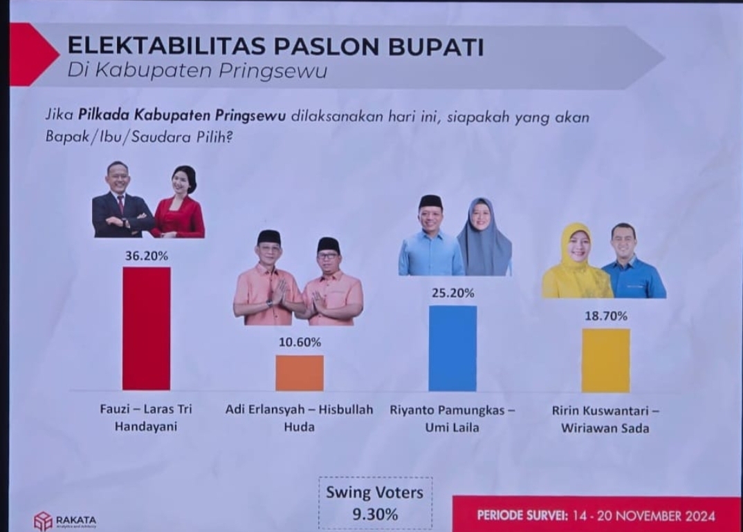 Pringsewu.Ekstranews.com- Hari pencoblosan pemilihan Bupati dan Wakil Bupati Pringsewu tinggal menghitung hari, hari ini hari terakhir kampanye, beberapa lembaga survai yang teruji seperti Rakata, di akhir kampanye hasil survai Fauzi – Laras menunjukkan telak menang dibandingkan calon lain.